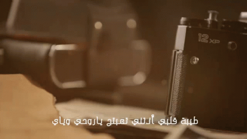 Close-up of a vintage 12 XP camera with lyrics from Rahma Riad's song 'Taybat Qalbi' (Kindness of My Heart).