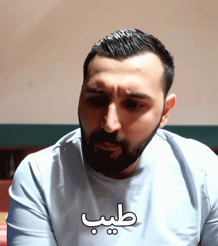 A man with a beard and light blue shirt speaks, with the Arabic word 'طيب' (Delicious) displayed on screen.