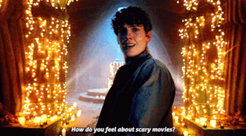 Tyler Galpin, from the series Wednesday, stands in a festive, lit room and asks, 'How do you feel about scary movies?'