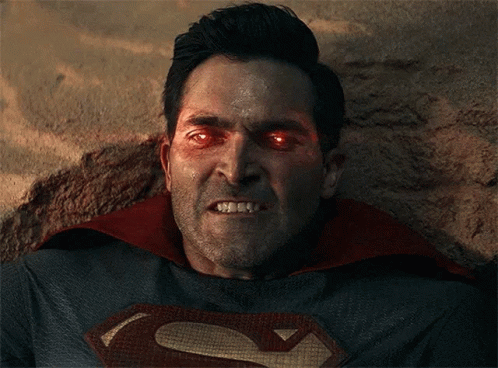 Tyler Hoechlin as Superman, lying on the ground with intense glowing red eyes, possibly using heat vision.