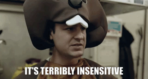 Tyler Hynes in a bear costume head, looking serious with the caption 'It's Terribly Insensitive'.