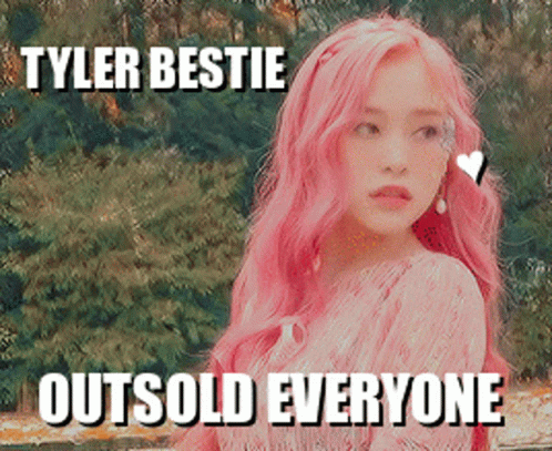 Gahyeon from Dreamcatcher as Tyler Bestie, with vibrant pink hair, captioned 'Outsold Everyone'.