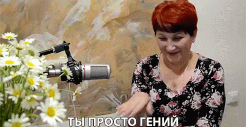 Woman reacts to 'You are just a genius' while sitting by a microphone and flowers.