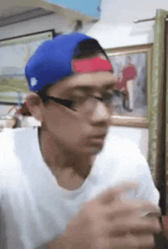 Tyrone Tiaga, wearing a blue hat and glasses, gets startled while looking to the side.