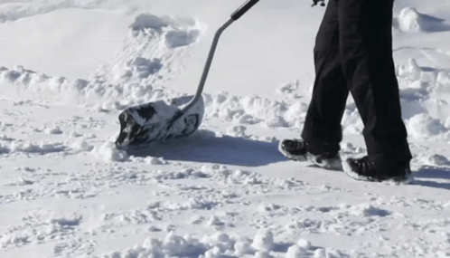 A person efficiently shoveling snow from a sidewalk with a shovel on a bright, winter day.