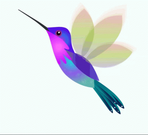 Animated colorful hummingbird, purple, pink, and teal, hovering against a white background.