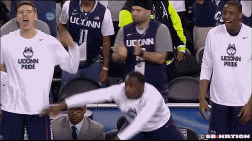 UConn Huskies basketball players and staff erupt in celebration on the bench during a game.