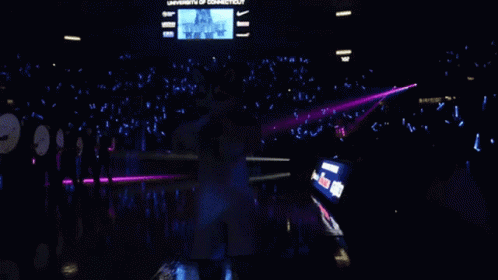 UConn Huskies mascot Jonathan hypes up the crowd on the basketball court during a game, wearing his number 1 jersey.