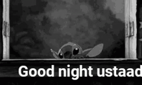 Stitch from Lilo & Stitch peeks out from a window in a black and white animation, wishing 'Good night ustaad'.