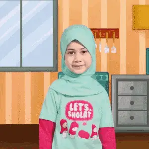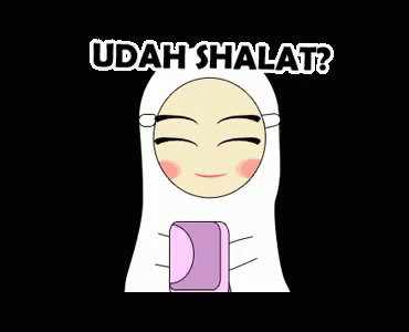 Cartoon Muslimah smiling, wearing a white hijab, holding a purple object, with the text 'U' visible.