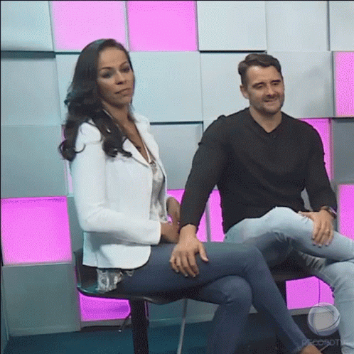 Paula Pequeno e um homem sentados em um estúdio, ela gesticula enquanto ele sorri. Cena de Power Couple Brasil.