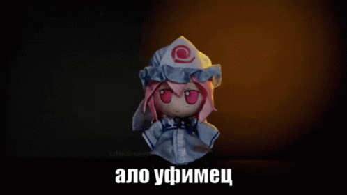 A Fumo plushie, specifically Yuyuko Saigyouji, with pink hair and a white hat, featuring the Russian caption 'ало уфимец'.