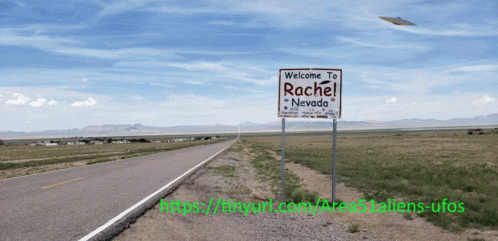 A UFO hovers over the 'Welcome to Rachel, Nevada' sign on a desert road, near the famous Area 51.