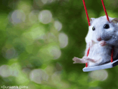 A small, light-colored hamster sits on a miniature swing, holding something to its mouth.