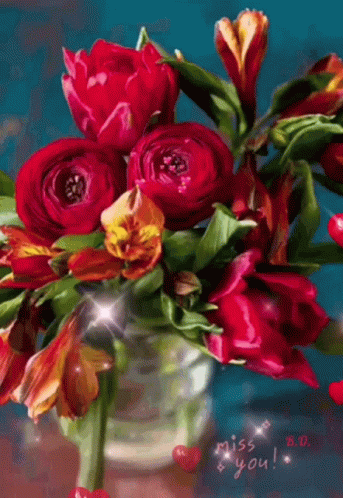 A vibrant bouquet of red flowers in a vase, enhanced with sparkling effects and floating hearts, displaying "miss you!".