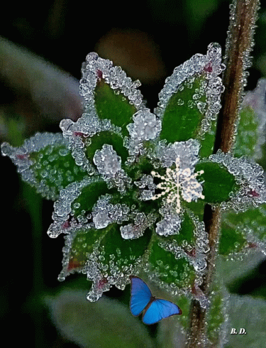 A vibrant blue butterfly rests on a green plant covered in sparkling frost and ice crystals.