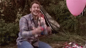 Chris Pratt joyfully celebrates outdoors with arms raised, surrounded by balloons.