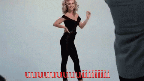 A woman with curly blonde hair in a black off-the-shoulder dress dances energetically against a white background.