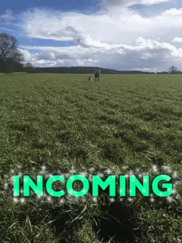 Roxy the Leavitt Bulldog runs across a green field under a cloudy sky, with 'INCOMING' text displayed.