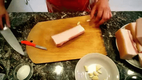 A person is preparing and cutting a large piece of Ukrainian salo on a wooden board, with garlic and salt nearby.