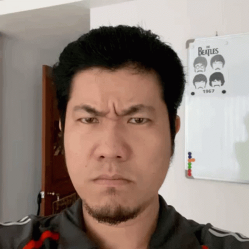 Ukus Usuk makes funny and thoughtful facial expressions in front of a Beatles poster.