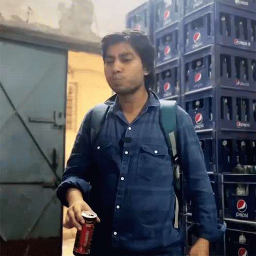 Arshad reacts strongly to a bad-tasting drink, appearing to vomit in front of Pepsi crates.