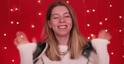 Ira Blan joyfully laughing and smiling with hands raised in excitement against a festive red background.