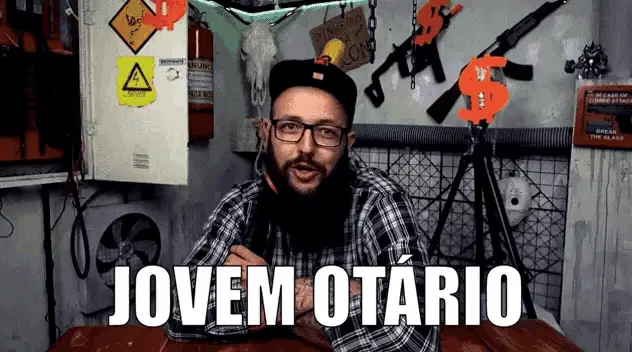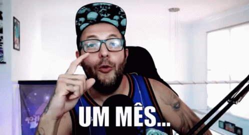Brazilian YouTuber Cauê Moura points up, emphasizing 'Um Mês' (One Month) with a serious expression.