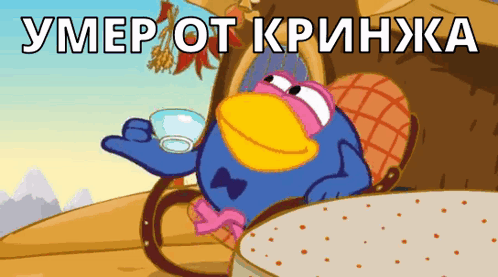 Karkarych from Smeshariki reacts with extreme cringe, collapsing in a chair, accompanied by the text 'Died From Cringe'.