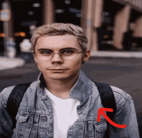 Yan Topless, a young man in glasses and a denim jacket, surrounded by fire, with a red arrow pointing.