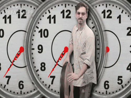 Gallo Bluguermann holding a large clock with an exasperated expression as the meme phrase 'it's time to stop' appears.