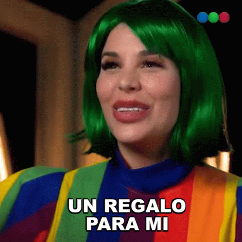 Charlotte Caniggia, wearing a vibrant rainbow shirt and green wig, expresses "A gift for me" on Masterchef Celebrity Argentina.