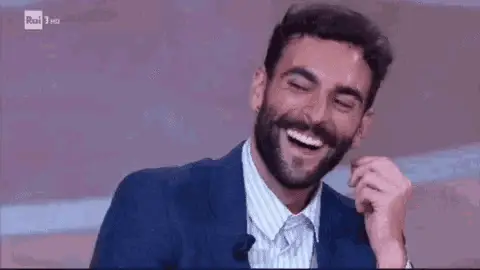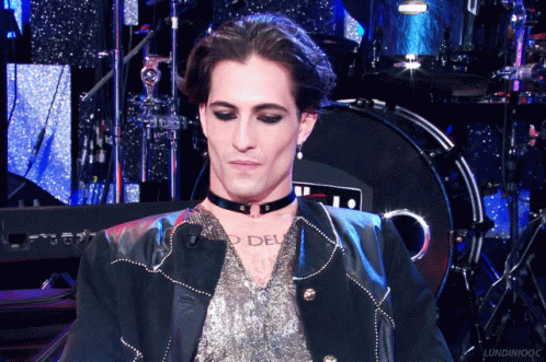 Damiano David of Maneskin trying to hold back a laugh during Una Pezza Di Lundini.