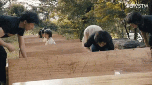 People emerge from wooden coffins arranged as stairs, assisted by others, in a challenge featuring Le Floid.