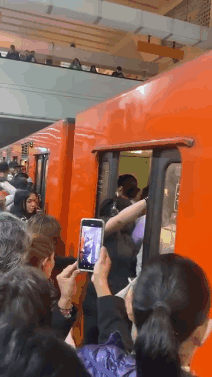 A crowded Mexico City Metro train where passengers struggle to board and close the doors, with many onlookers filming the chaotic scene.