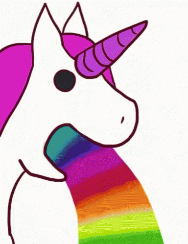 A cartoon unicorn with a pink mane and purple horn pukes a vibrant rainbow.