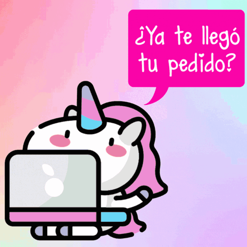 A cute cartoon unicorn sits at a laptop, asking if your order has arrived yet.