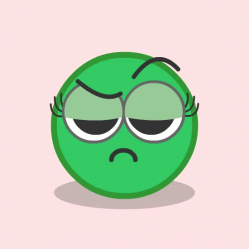 A green unimpressed emoji with half-closed eyes and a downturned mouth blinks slowly.