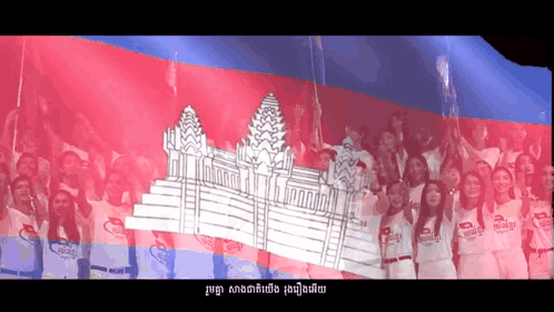 A large crowd of people in white celebrate in front of a giant Cambodian flag featuring Angkor Wat, with the caption 'Our nation and the Kingdom'.