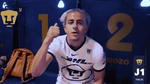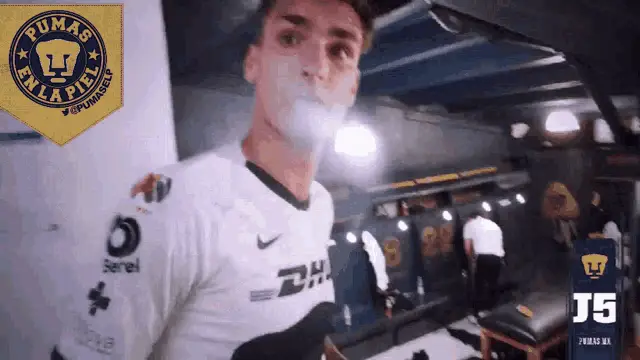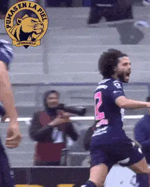 Alan Mozo, wearing a Pumas jersey, passionately celebrates, pumping his fist in excitement.