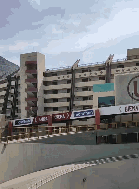 Exterior view of Estadio Monumental U, home of Universitario De Deportes, featuring 'Marathon' sponsorship and 'BIENVENIDOS AL' sign.