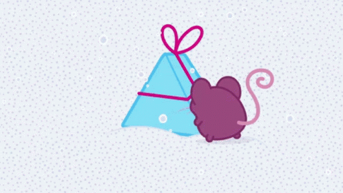 A cute purple mouse excitedly unwraps a blue gift, revealing a delicious yellow cheese wedge inside.