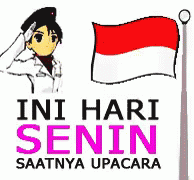 A cartoon man saluting the Indonesian flag (Merah Putih) during a Monday morning ceremony.