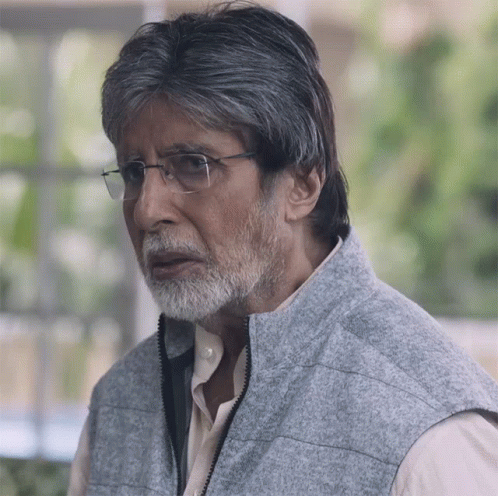Amitabh Bachchan looking up with a thoughtful expression, wearing glasses and a gray vest.