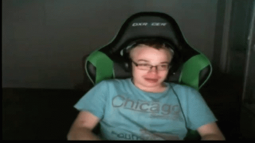 Upi Kkona sitting in a gaming chair, wearing glasses and a Chicago t-shirt with headphones on.