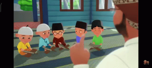Upin, Ipin, and friends learning to recite the Quran with their teacher in a mosque.