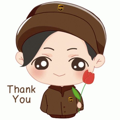 Chibi-style UPS delivery man from Asia, wearing a brown uniform, holds a red tulip and expresses 'Thank You'.