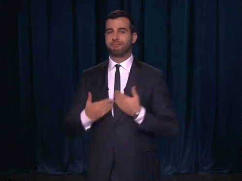 Ivan Urgant, dressed in a suit and tie, expresses excitement with various gestures and a big smile.