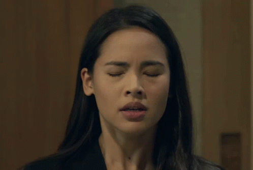 Urassaya Sperbund sighs with a stressed and disappointed expression, closing her eyes.