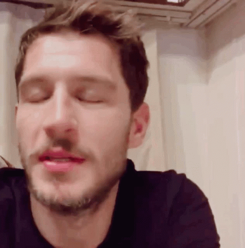 Uraz Gediz makes a funny face, closing his eyes and pouting his lips.
